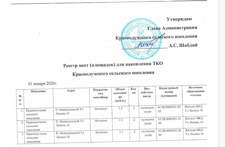 Реестр мест (площадок) для накопления ТКО Краснолучского сельского поселения