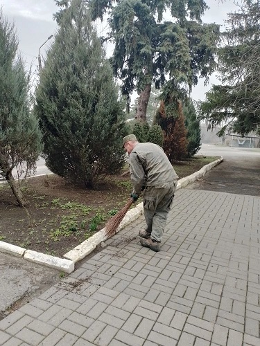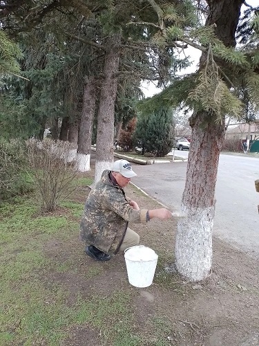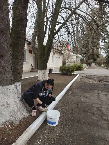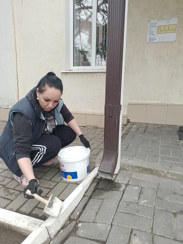 Вооружившись граблями, вениками очистили территорию около администрации от листвы и мусора, подготовили клумбы для посадки цветов, покрасили бордюры, побелили деревья.