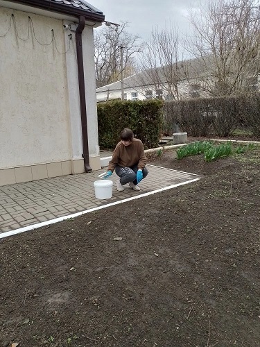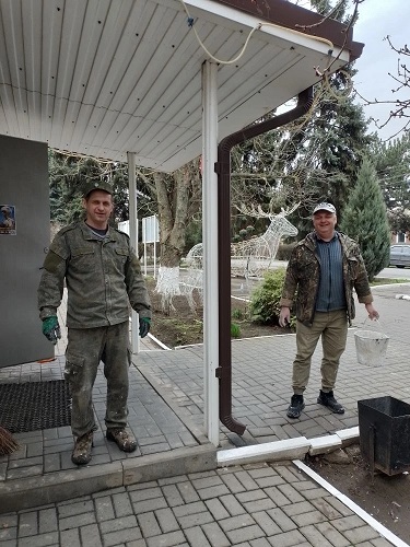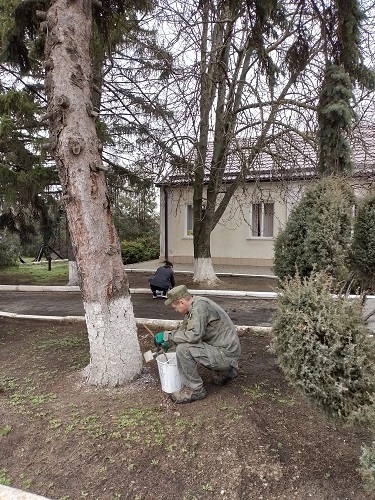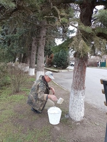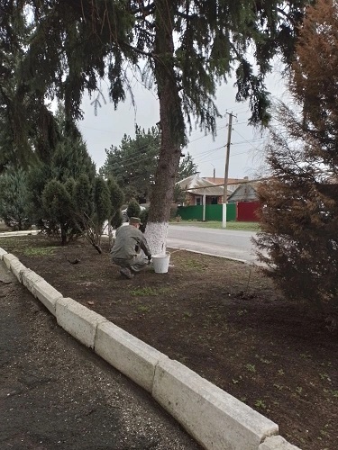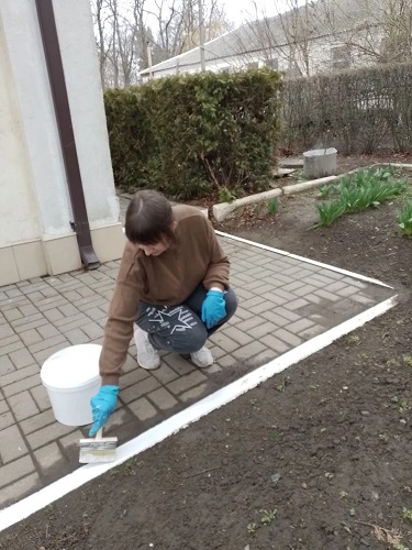 Вооружившись граблями, вениками очистили территорию около администрации от листвы и мусора, подготовили клумбы для посадки цветов, покрасили бордюры, побелили деревья.